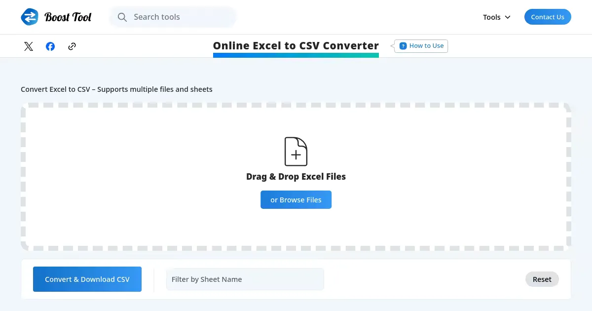 A free online tool to convert Excel files to CSV format in the browser. Supports multiple sheets, with the converted files available for direct download.