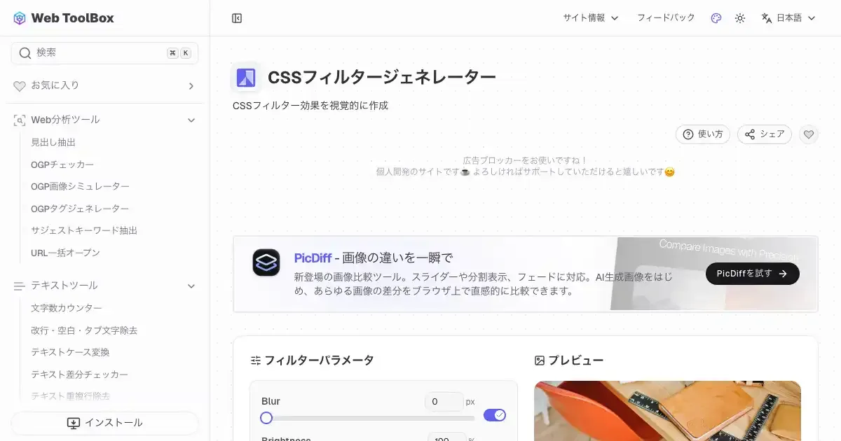 Free tool for visually adjusting and generating CSS filter property values. Intuitively set blur, brightness, contrast, saturation, hue rotation, and more, then copy the CSS code.