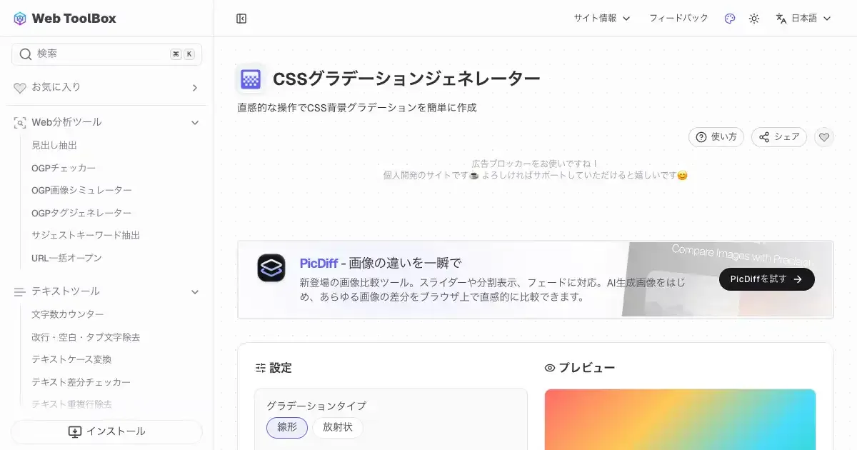 Free tool for visually generating CSS gradients (linear-gradient and radial-gradient). Intuitively adjust colors, angles, and positions, then copy the generated CSS code.