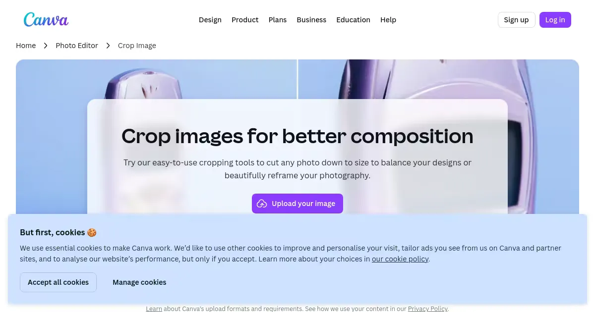 A free online image cropping tool by Canva. Supports freeform cropping with multiple aspect ratios, Smart Crop for automatic composition detection, and frame-based cropping into decorative shapes like circles and hearts.