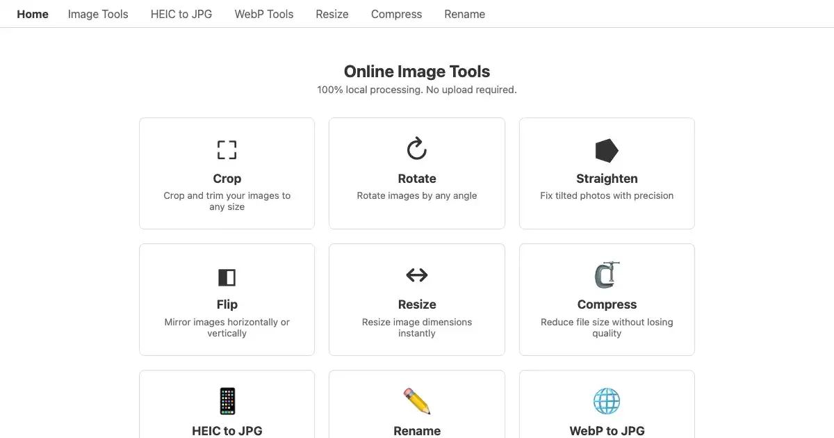 Browser-based image editing and conversion tools including crop, resize, compress, rotate, HEIC-to-JPG, and WebP conversion. All processing is done locally with no file upload required.