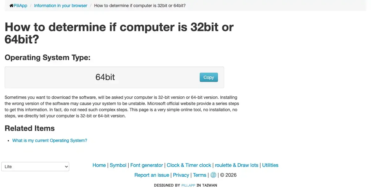 An online tool that detects whether your computer is running a 32-bit or 64-bit operating system. Check your system architecture instantly without opening system settings.
