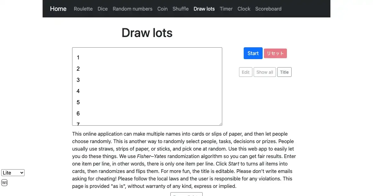 An online lot-drawing tool for fair random selection. Enter options and draw lots to randomly pick one, useful for deciding turns, assignments, or prizes.