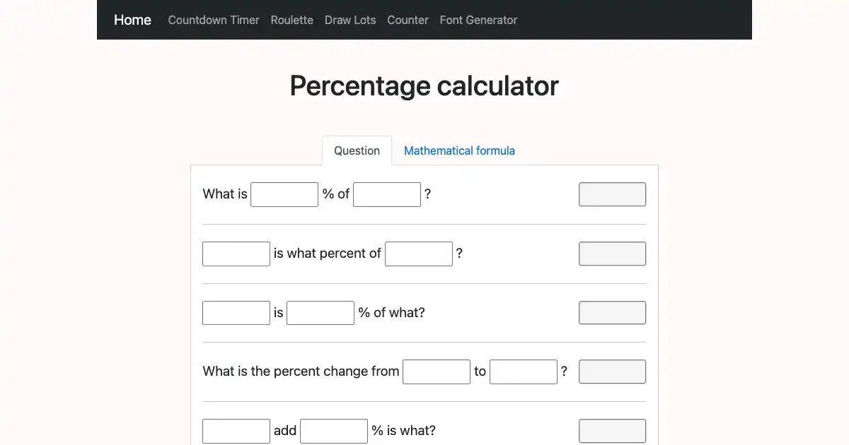 An online percentage calculator for quick percent computations. Calculate what percentage one number is of another, find percent increase or decrease, and more.