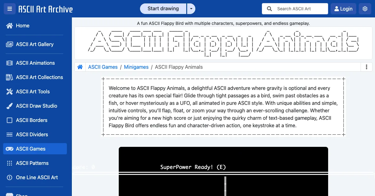 A Flappy Bird-inspired ASCII art game with multiple animal characters and superpowers. Navigate through pipes using unique character physics and strategic power-ups.