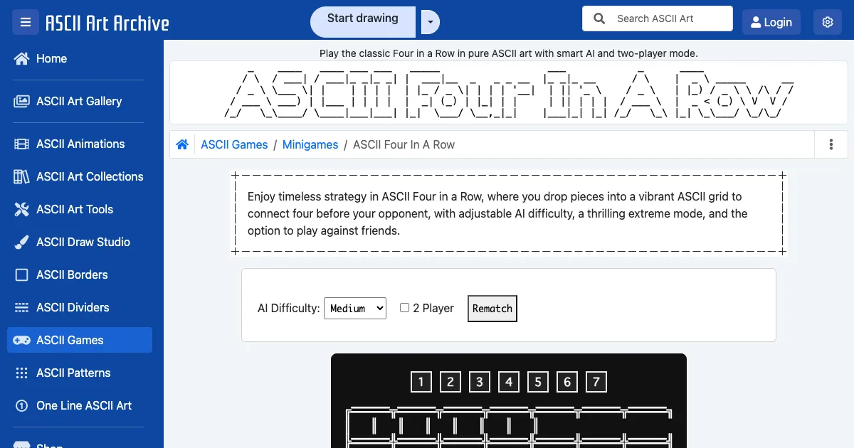 A Connect Four game rendered in ASCII art. Drop pieces into a 7x6 grid to align four in a row against a smart AI or a second player. Supports multiple AI difficulty levels.