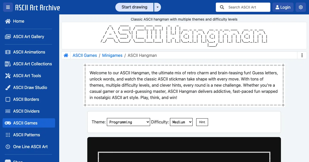 A classic word-guessing hangman game rendered in ASCII art. Features multiple word themes, four difficulty levels, and a hint system to reveal hidden words before the gallows completes.