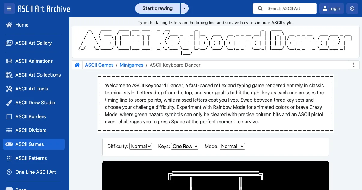 A terminal-style reflex typing game where letters fall from above and you must press the correct key as each one crosses the timing line. Features multiple key sets and difficulty levels.