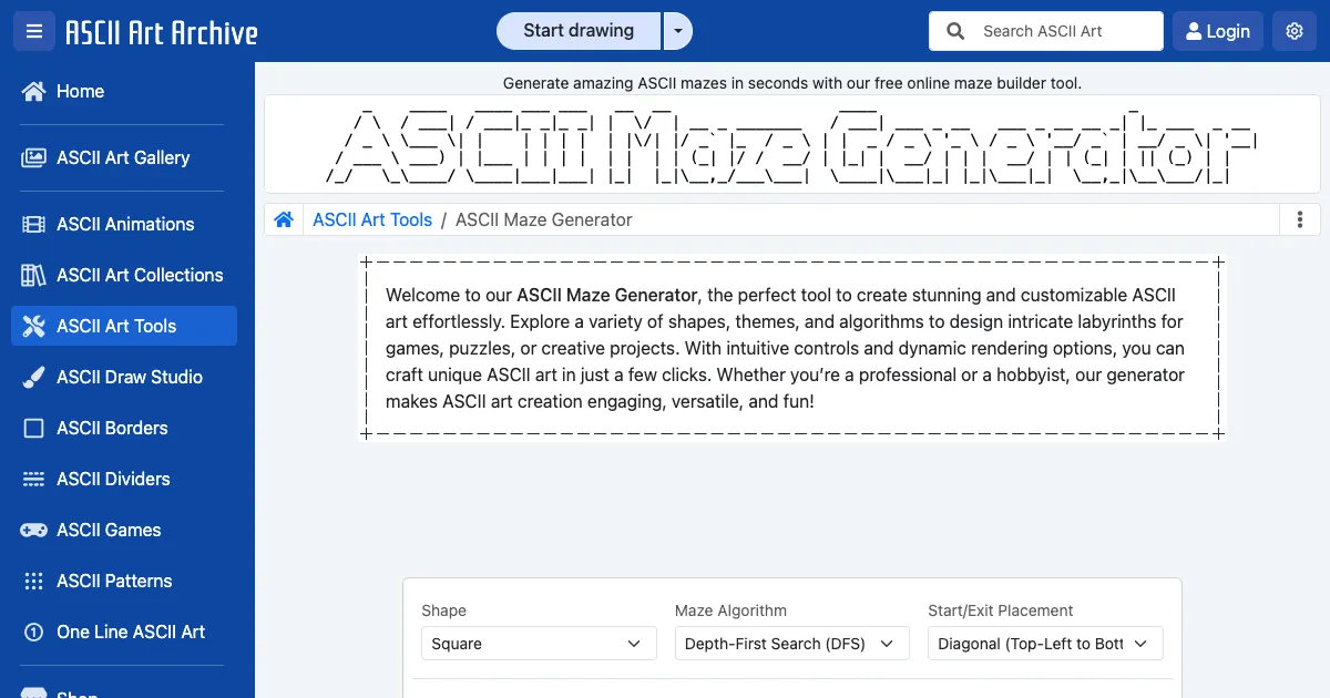 A free online maze generator that creates ASCII art labyrinths. Supports multiple shapes, generation algorithms, visual themes, 3D walk mode, and export to TXT/PNG/JPG/GIF/SVG/PDF.