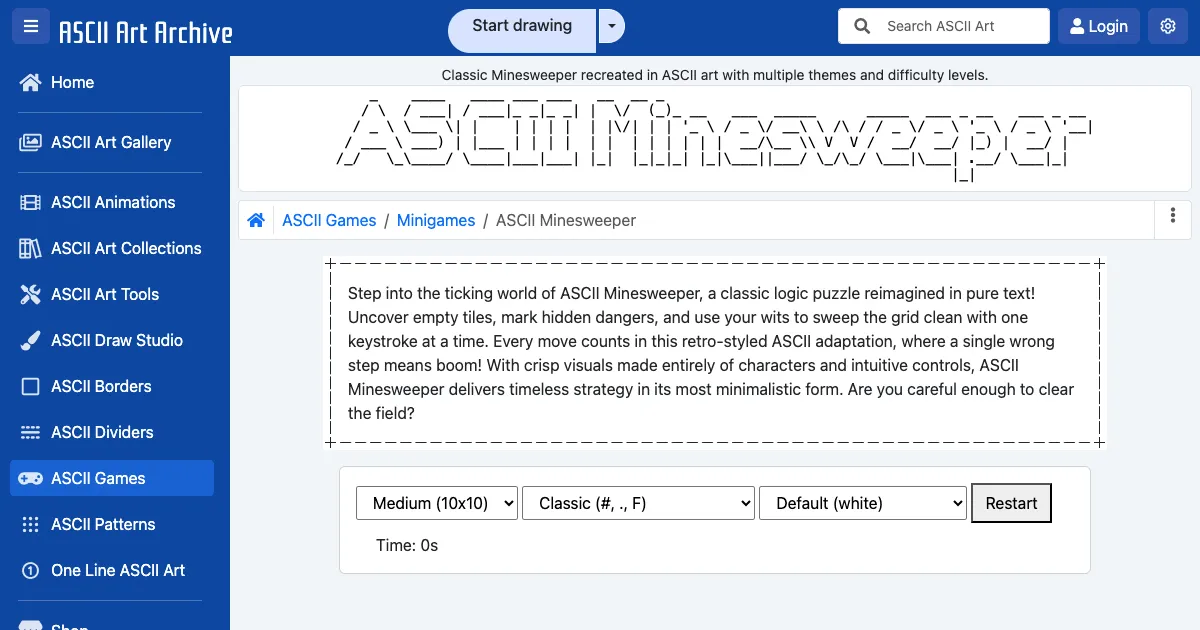 A classic minesweeper logic puzzle rendered in ASCII art. Reveal all safe cells without hitting mines on grids from 6x6 to 20x20, with multiple ASCII themes and color schemes.