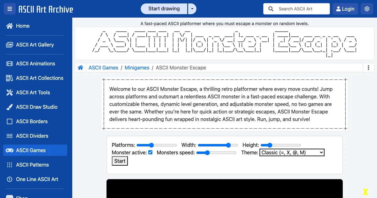 A fast-paced ASCII art platformer where you escape a pursuing monster across procedurally generated levels. Features wall jumping, adjustable difficulty, and multiple visual themes.