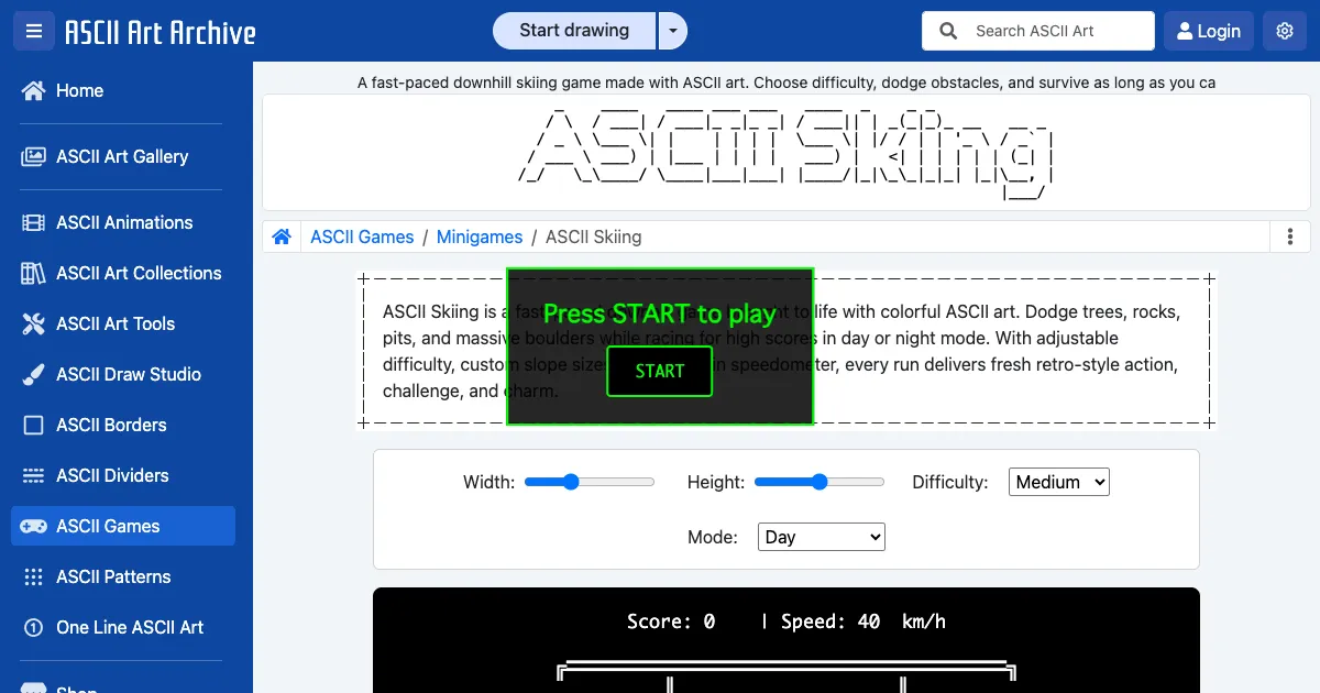 A fast-paced ASCII art downhill skiing game. Dodge trees, rocks, and pits while racing for high scores. Features multiple difficulty levels and day/night modes with increasing speed.