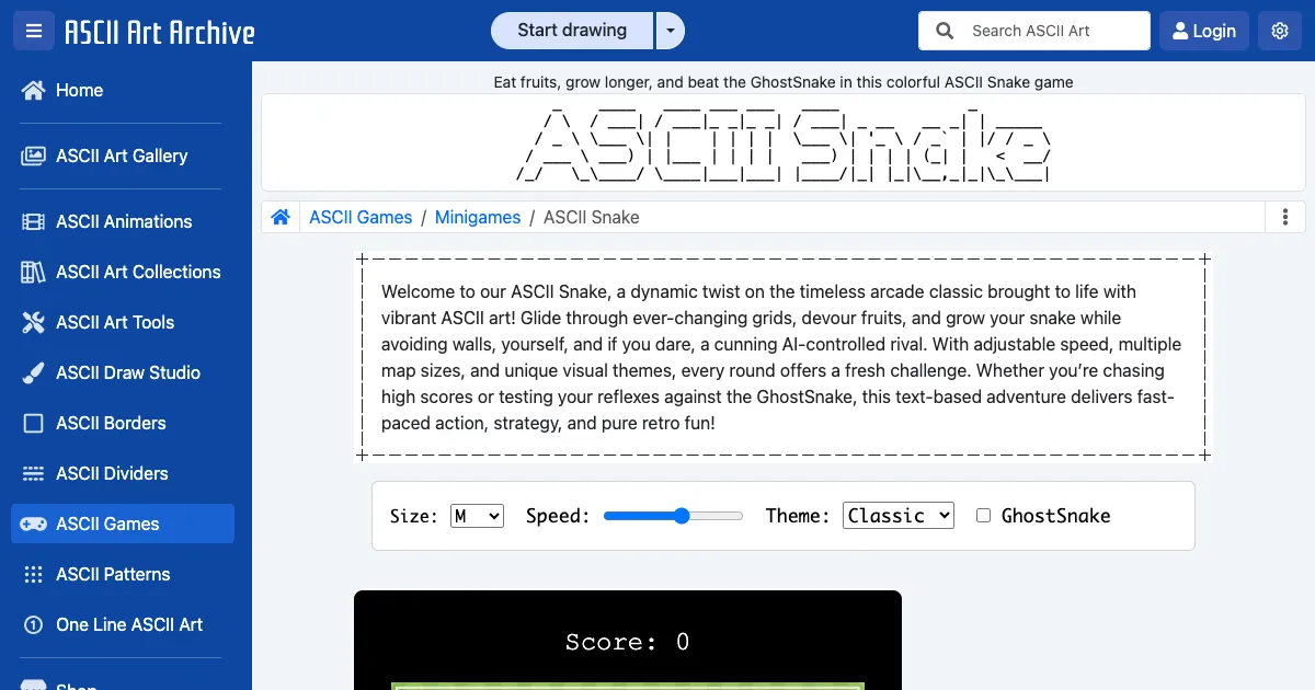 A classic snake game rendered in colorful ASCII art. Eat fruits to grow longer and compete against the GhostSnake AI. Features adjustable map sizes, speed settings, and visual themes.