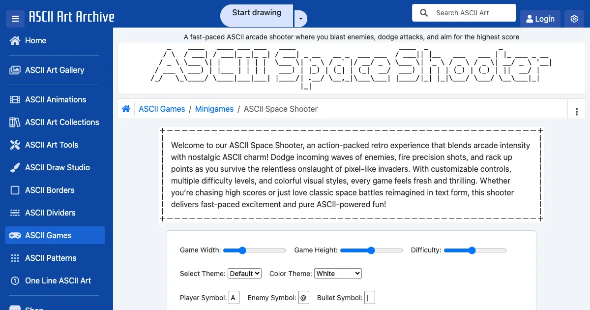 A fast-paced ASCII art arcade shooter. Blast enemy waves, dodge attacks, and aim for the highest score. Features adjustable difficulty, color themes, and customizable controls.