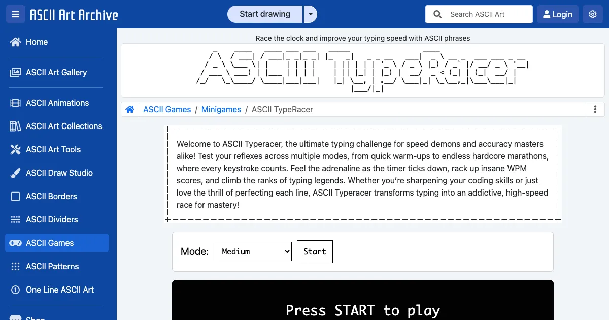 A typing speed game where you race the clock by typing ASCII phrases. Compete across Easy, Medium, Hard, Extreme, and Endless modes, tracking your WPM and accuracy.