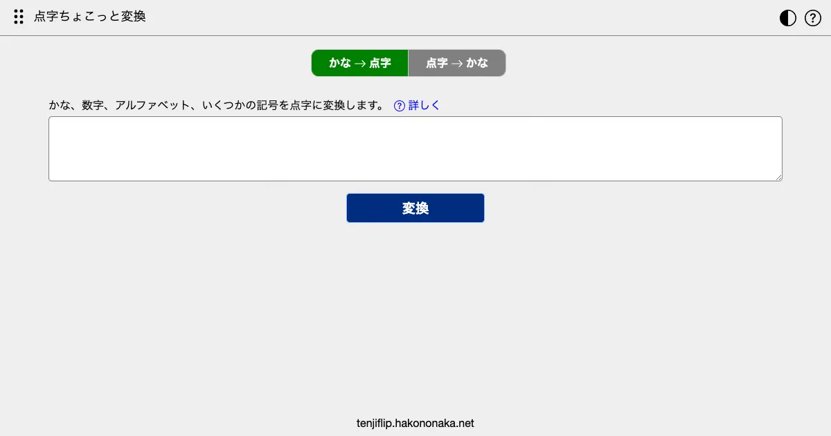 A web tool for converting hiragana, katakana, numbers, alphabets, and symbols to Braille, and for reverse-converting Braille back to kana. Supports both convex (reading) and concave (writing) display formats.