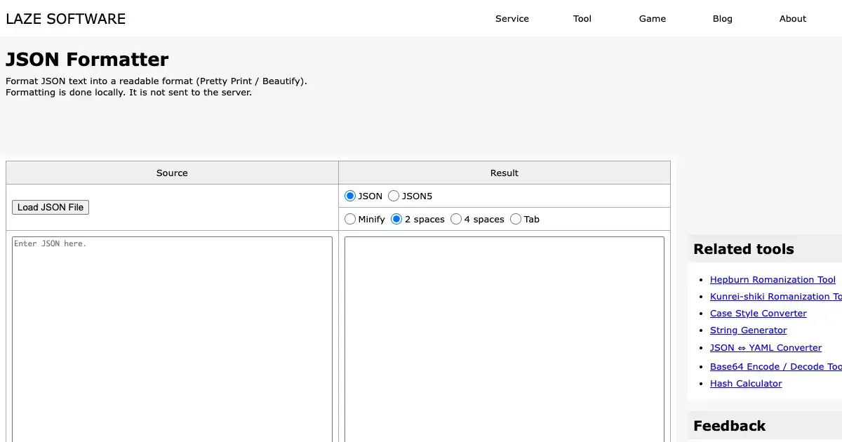 Formats JSON text into a readable form (Pretty Print / Beautify). Supports JSON5, Minify, configurable indentation (2 spaces, 4 spaces, or tab), and files up to 5MB. All processing runs locally without server transmission.