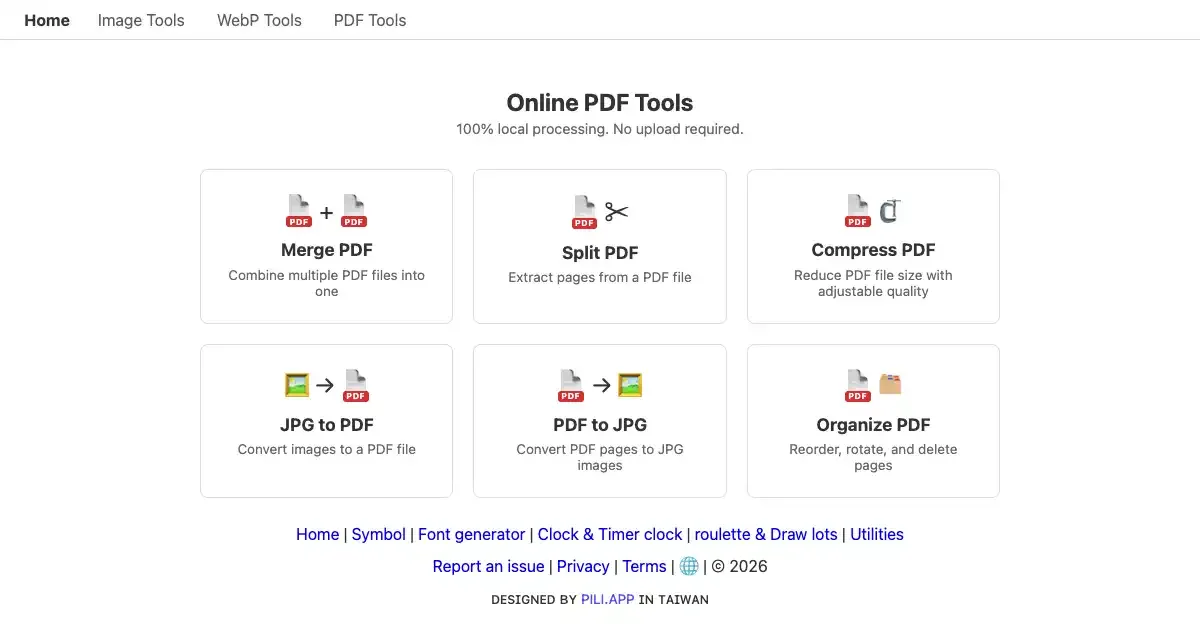 A collection of browser-based PDF utilities including merge, split, compress, JPG-to-PDF, PDF-to-JPG, and organize. All processing is done locally with no file upload required.