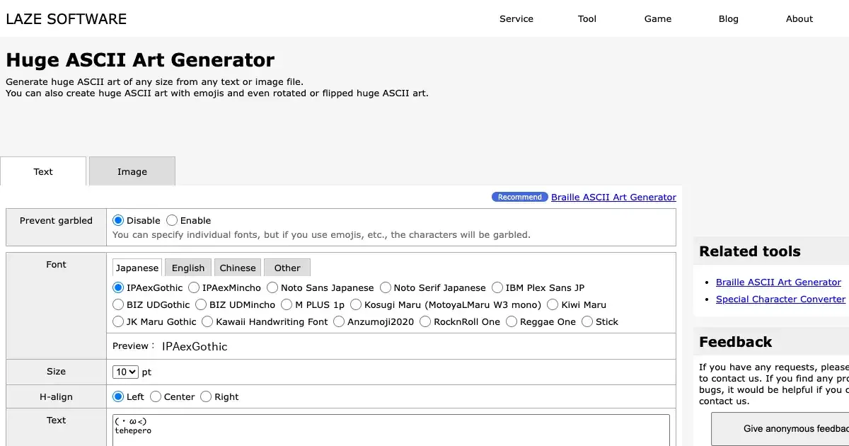 Generates large-scale ASCII art from text or image inputs. Supports multiple fonts (Japanese, English, Chinese), emoji, rotation, flipping, invert, and monochrome or color modes. Results can be downloaded as text or image files.