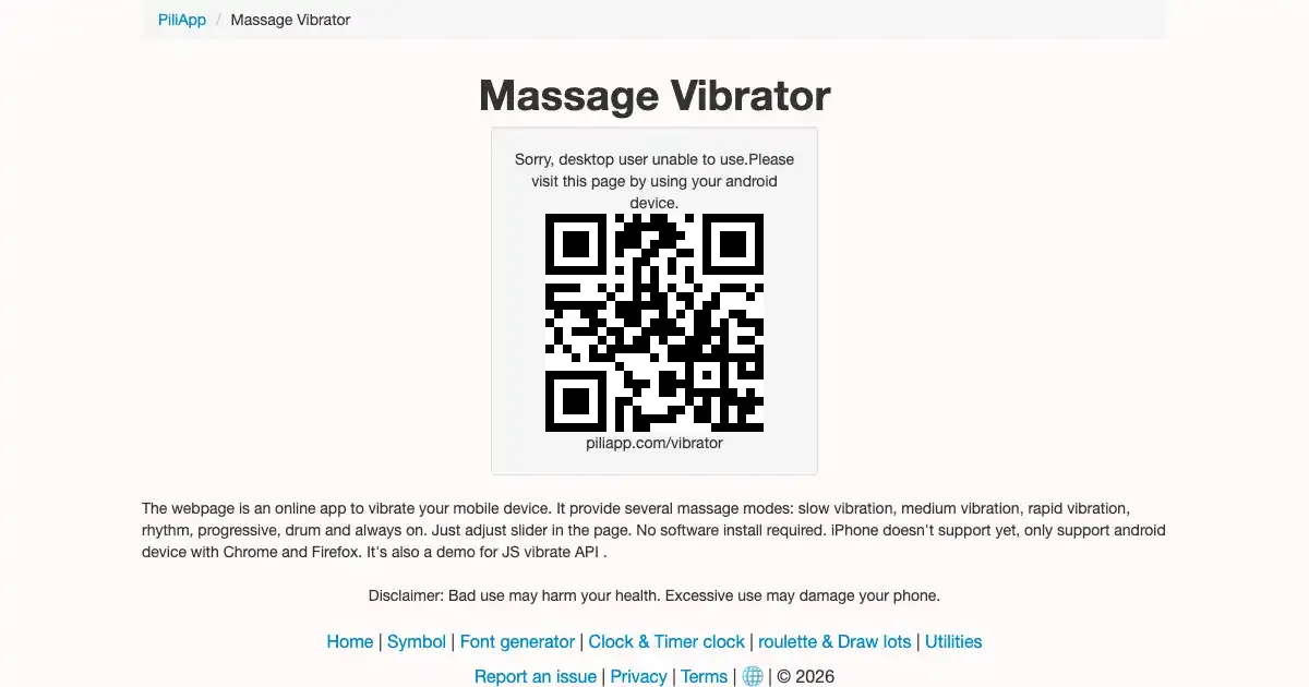 An online tool that uses the browser's Vibration API to make your mobile device vibrate in customizable patterns. Control intensity and rhythm for a relaxing massage experience.
