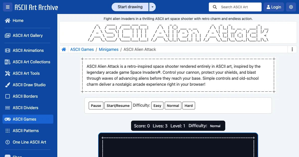 A retro ASCII art space shooter inspired by Space Invaders. Destroy waves of alien invaders while avoiding their fire. Features multiple levels with increasing difficulty.