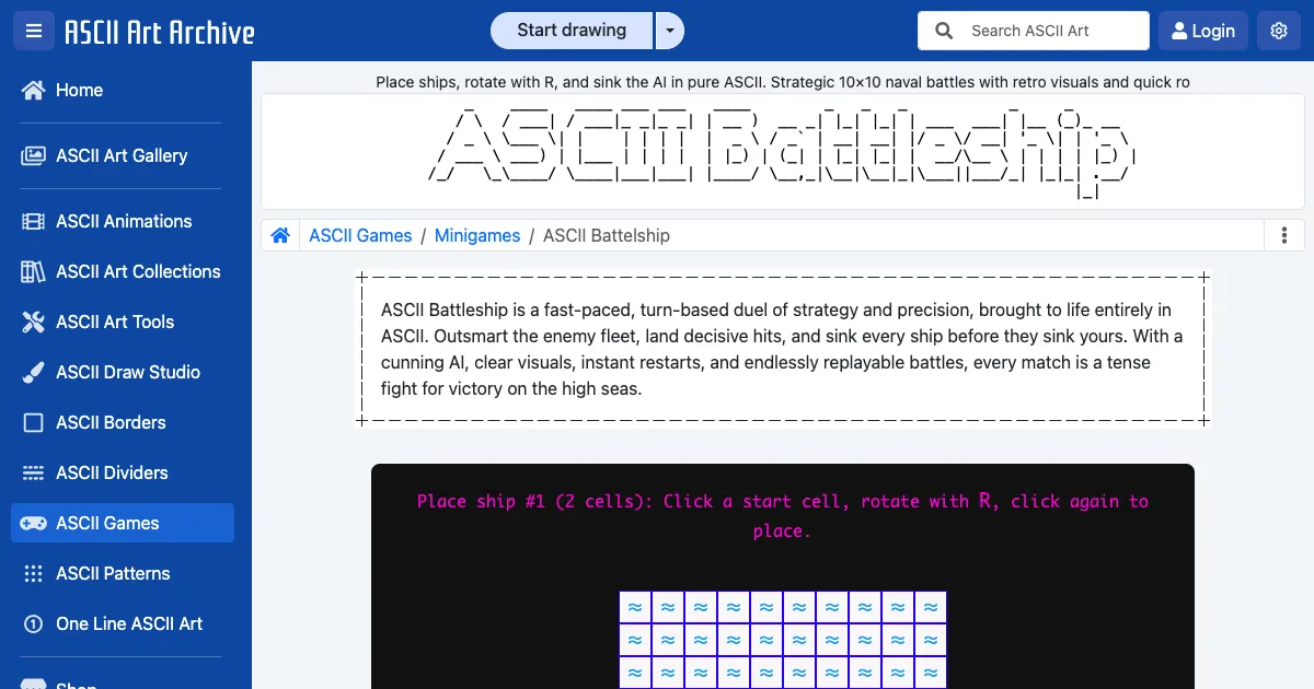 A turn-based ASCII art battleship game against an AI opponent. Place your fleet on a 10x10 grid and sink all enemy ships before they sink yours.