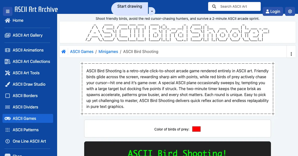 A click-to-shoot ASCII arcade game where you shoot friendly birds for points while avoiding red hunter birds. Features a 2-minute time limit with accelerating difficulty.