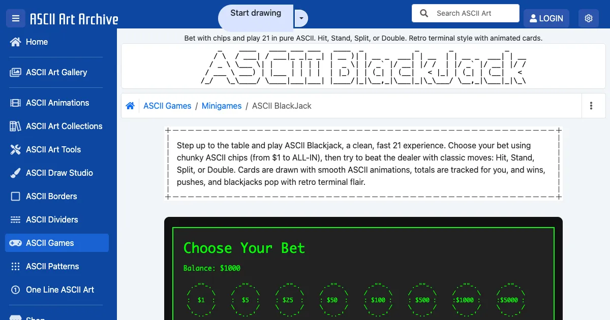 A retro terminal-style ASCII art blackjack game. Bet with virtual chips and play 21 against the dealer with Hit, Stand, Split, and Double Down actions.