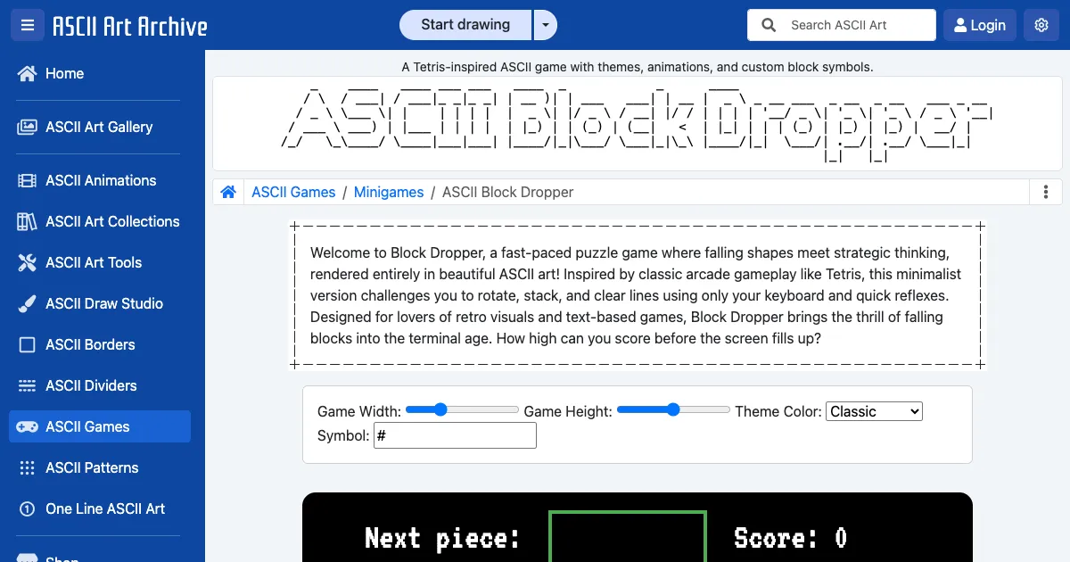 A Tetris-inspired ASCII art puzzle game. Rotate and stack falling blocks to clear lines and score points. Supports customizable grid size, themes, and block symbols.