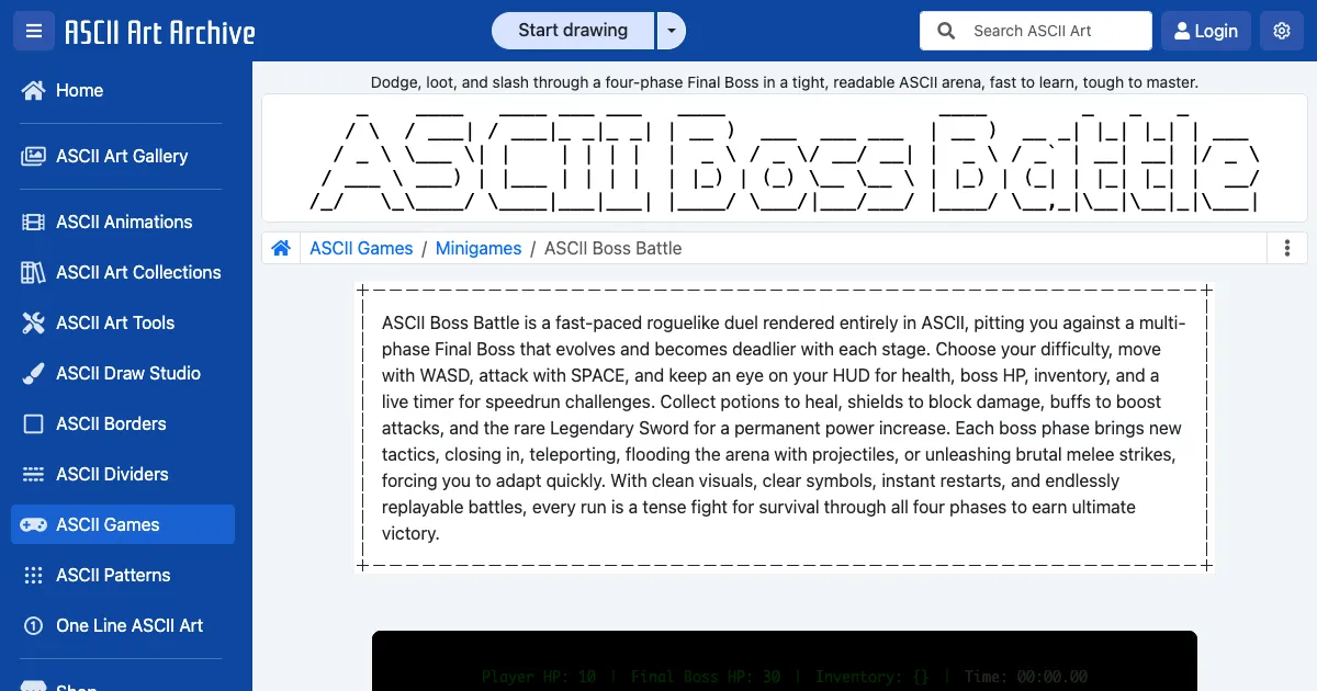 A roguelike ASCII art boss fight game. Dodge projectiles, collect power-ups, and slash through a four-phase final boss in an intense duel with increasing difficulty.