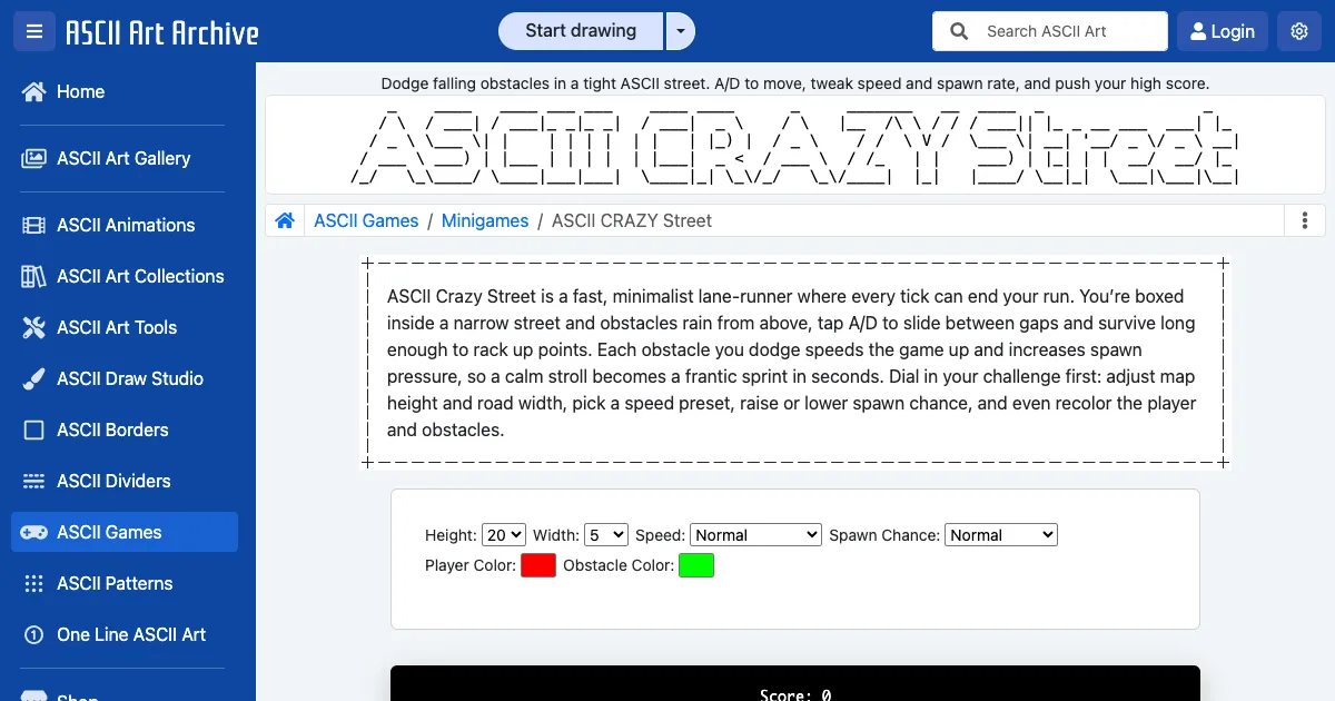 A fast-paced ASCII art dodge game. Move left and right to avoid falling obstacles in a narrow street, scoring one point per dodge as the difficulty ramps up automatically.