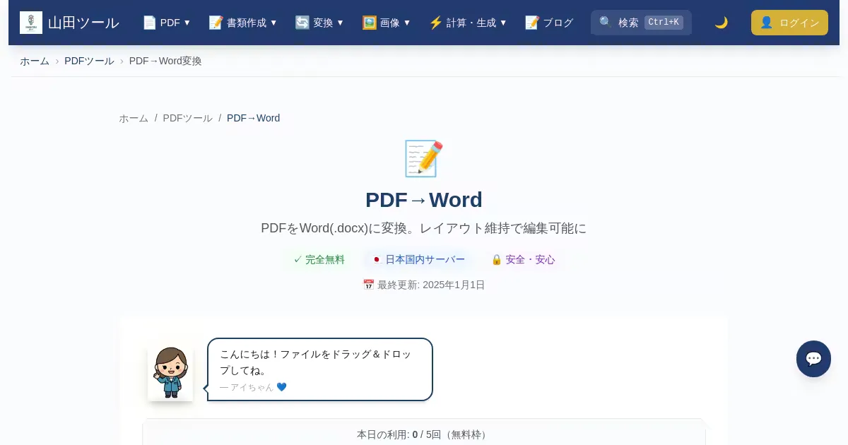 Free online tool to convert PDF files to editable Word documents (.docx). Extracts text and images from PDFs. No registration required. Files are processed on Japanese domestic servers with SSL encryption and automatically deleted after 60 minutes.