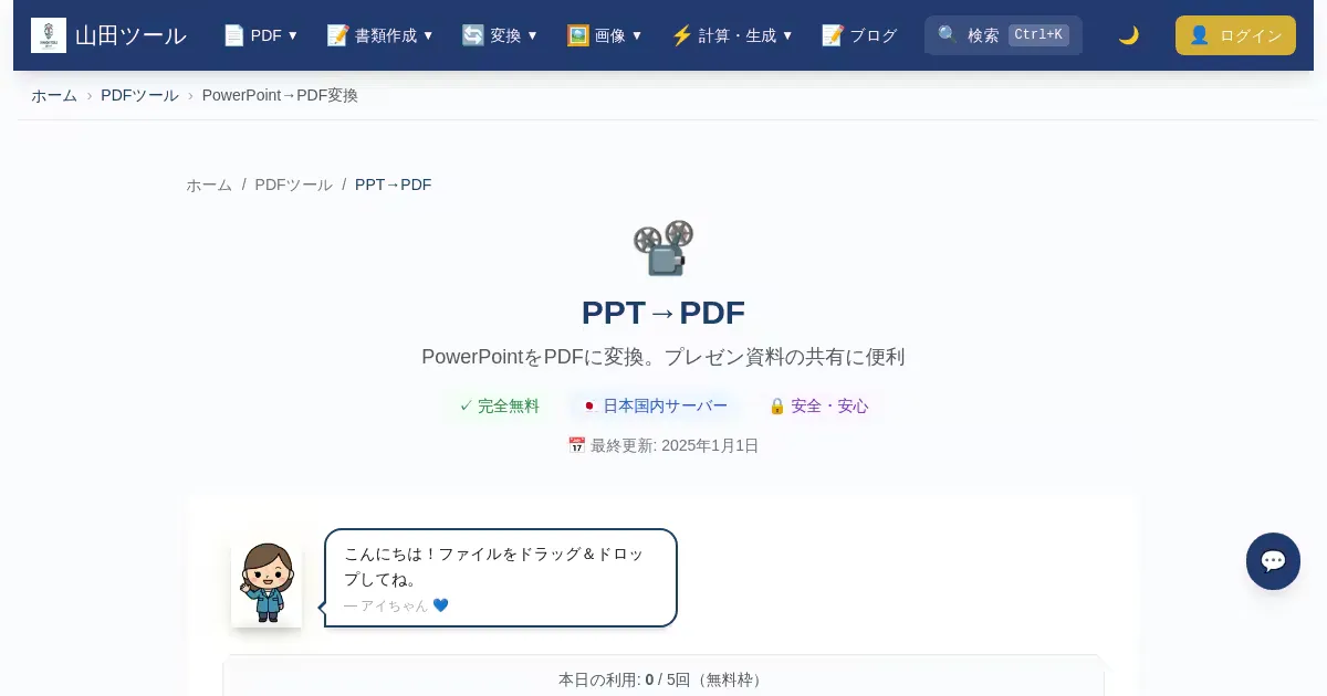 Free online tool to convert PowerPoint presentations (.ppt, .pptx) to PDF. No registration required. Files are processed on Japanese domestic servers with SSL encryption and automatically deleted after 60 minutes. Supports files up to 20MB.