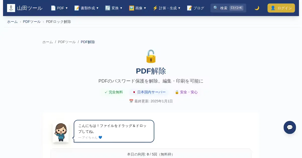 Free online tool to remove password protection from PDF files. Eliminates the hassle of entering a password repeatedly or when editing with other PDF tools. Files are processed on domestic servers and auto-deleted after 60 minutes.