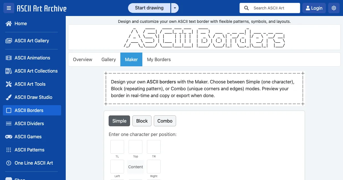 A browser-based tool to design and customize ASCII text borders. Supports three design modes (simple, block, combo), adjustable dimensions, retro color themes, and export to TXT/PNG/JPG/GIF.