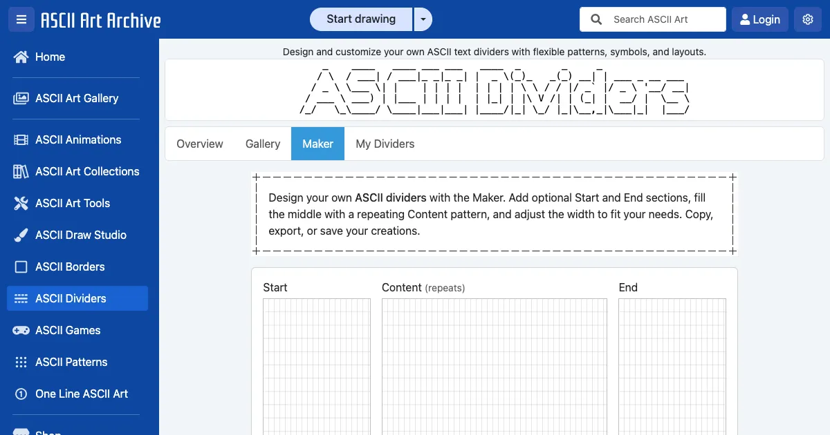 | URL | https://www.asciiart.eu/ascii-dividers/maker |