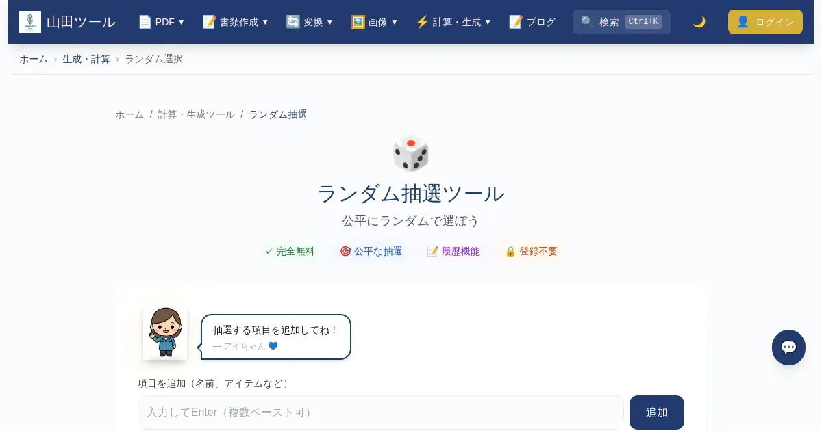 A browser-based tool for randomly selecting names or numbers from a list. Useful for lottery draws, deciding order, team formation, and assigning party coordinator roles.