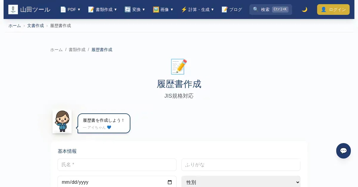 Create JIS-standard resumes for free. Supports photo uploads (auto-adjusted to 3cm×4cm) and PDF output. No registration required, with automatic data deletion after 60 minutes.