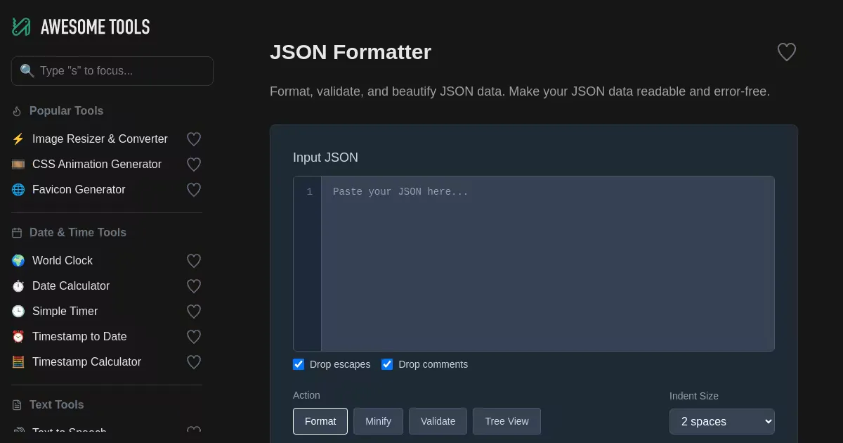 Format, validate, and beautify JSON data. Supports minification, syntax validation, and tree view for hierarchical browsing. Offers customizable indentation with options to drop escapes and remove comments.