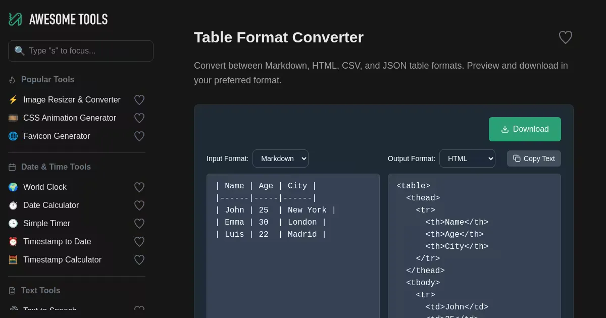 Convert between Markdown, HTML, CSV, and JSON table formats. Features real-time HTML preview and download capability for your preferred output format. Input and output format selectable via dropdowns.
