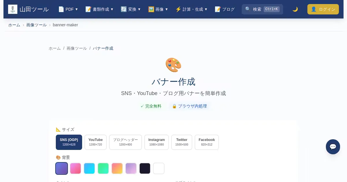 Free online tool for creating banner images for SNS, YouTube, and blogs. Supports size presets, text overlay with font and color options, and background image upload or solid color fill. Runs entirely in the browser.