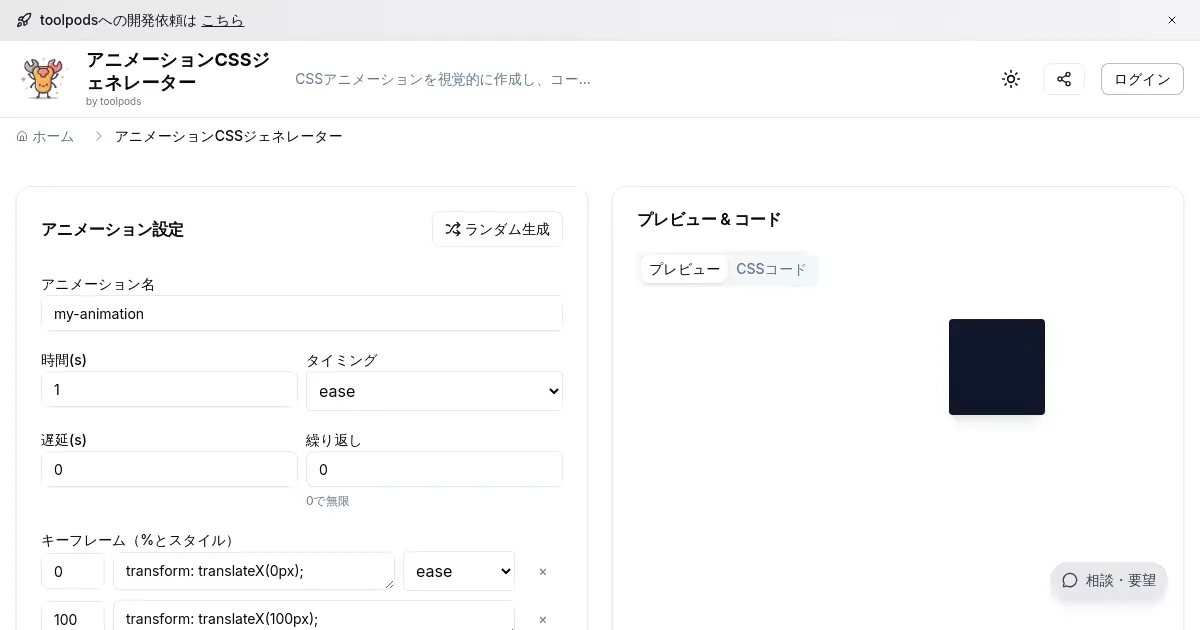 CSS アニメーションのコードを GUI で生成するツール。アニメーションの種類・速度・タイミング関数などを直感的に設定し、生成した CSS コードをコピーして利用できる。