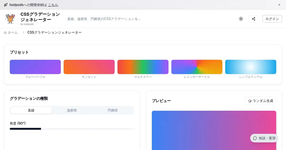 CSS のグラデーション(linear-gradient・radial-gradient)をビジュアルで生成するツール。色・角度・位置などを設定し、生成された CSS コードをコピーして利用できる。