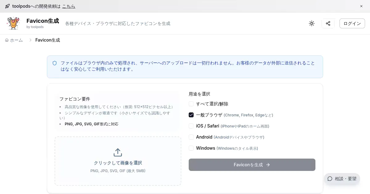 画像ファイルからブラウザの favicon を生成するツール。各種サイズの .ico や .png ファイルを一括で出力できる。
