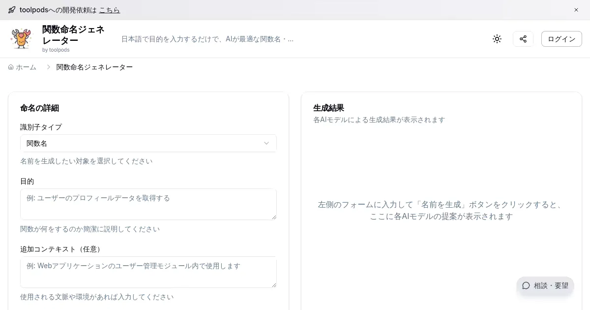 処理の概要を入力すると AI が適切な関数名を提案するツール。camelCase・snake_case など命名規則を選択できる。