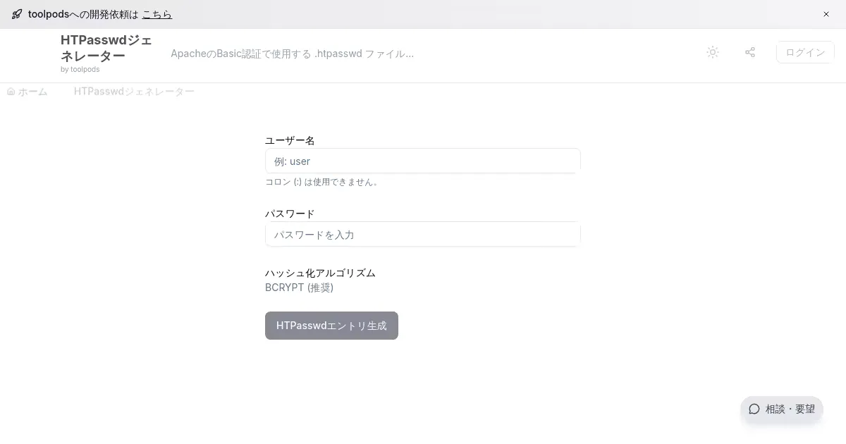 .htpasswd ファイル用のパスワードハッシュを生成するツール。Basic 認証の設定に使用できる。