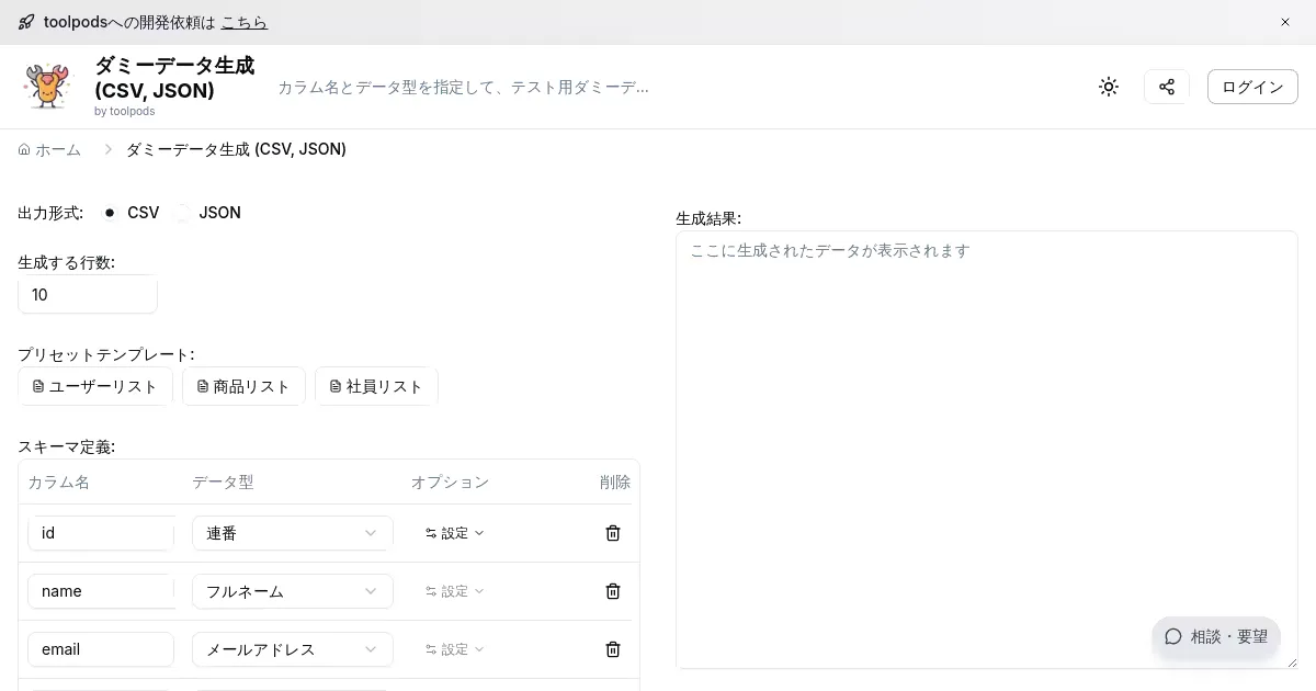 テスト用のダミーデータを生成するツール。名前・メール・電話番号など様々な形式のダミーデータを指定件数で出力できる。