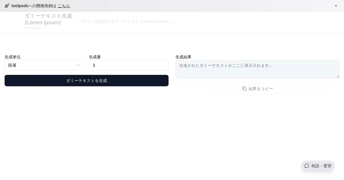 ダミーテキスト(Lorem Ipsum・日本語ダミー文など)を生成するツール。デザインのプロトタイプ作成に活用できる。