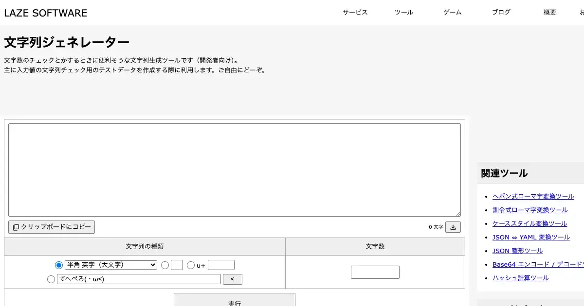 開発者向けのテストデータ生成ツール。半角英字・全角漢字・絵文字など多様な文字種と文字数を指定して文字列を生成できる。大小文字変換・全角半角変換・HTMLエスケープ・Base64エンコードなどの変換機能や、ソート・シャッフル・重複削除などの行単位処理も備える。
