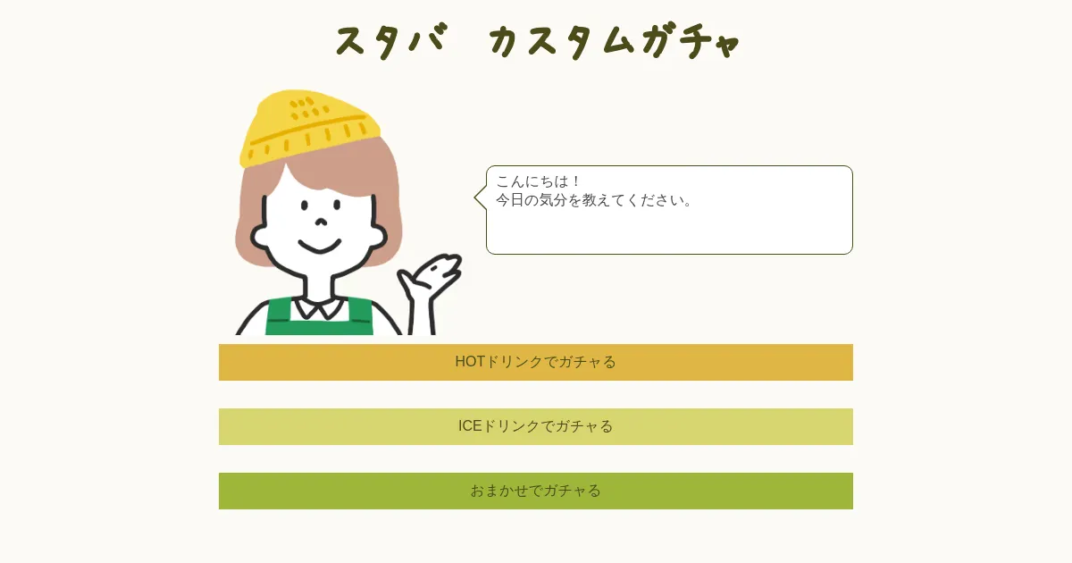 今日の気分を入力すると、スターバックスのカスタムドリンクをガチャ形式でランダムに提案してくれるツール。